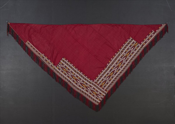 四角方巾邊縫彩色繡帶,是土庫曼特克族(Teke)用於圍住面頸的紅色方巾。繡帶上以細十字繡繡成箭頭符號,並施以鍊式與五絞絲鉤編條紋縫合,邊緣飾以細短流蘇。特克族在土庫曼斯坦是一個具有重要政治影響力的土庫曼部落。