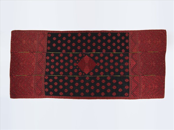 巴基斯坦北部科希斯坦地區刺繡披肩,黑棉布上以紅絲線繡出代表太陽的傳統圖案及富有生命力的連續花卉紋,源於該地區十九世紀以前主要信仰萬物有靈論。