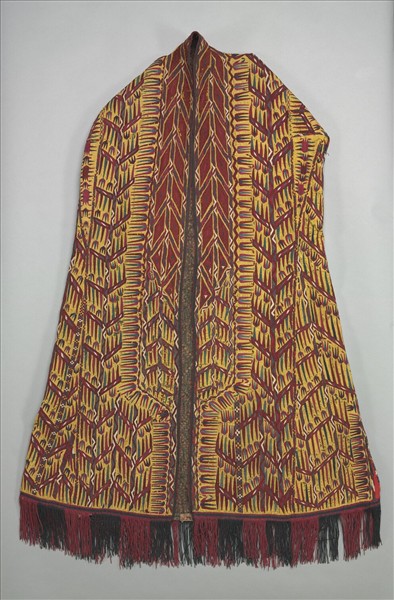 蓋頭衣雀兒比(chyrps)是土庫曼特克族(teke)傳統禮儀性刺繡服裝之一,如斗篷般蓋在頭和肩膀上,兩袖以繡帶固定在衣後為裝飾性用。黃棉布為面料,整件繡滿五彩絲線,衣擺底端綴以紅、綠色柔順流蘇,背後連結兩袖的裝飾帶,是銅色底飾以金花設計。製工精細高貴,色彩豔麗,氣派非凡。黃色多為中年婦女穿用。