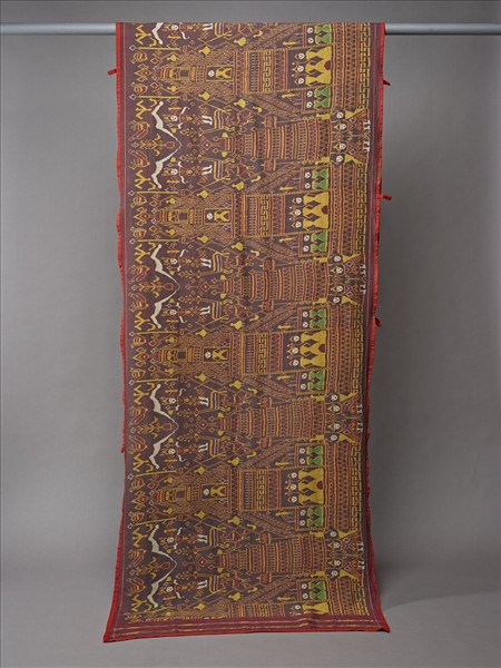 這件掛飾長達五公尺,為緯向伊卡絲織物,是柬埔寨虔誠的信徒供奉在寺廟的長幅掛飾,目的為求神保祐供奉者、染者和織工。掛飾上的圖案有多層寶塔、宮殿和穿著華麗的人物,以及生命樹、飛鳥與鹿等圖紋,篤信佛教的信徒,將雄偉的宮殿與鹿王的慈悲故事呈現在這幅織品上。 伊卡技法是先將圖案染在紗線上,之後再織造成布匹。一塊成品布由成千上萬條紗線構成,由於紗線柔細,數目繁多的紗線在織造過程中會有位移,製做過程十分精細費工,才能產生清晰的圖案,圖案邊緣也因此產生參差效果。