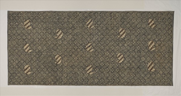 布幅散落勾型輪廓內填巴冷紋飾,底紋則是模仿印度帕托拉(patola)織品,以經、緯絲線按圖案設計先分段紮染後織造,又稱雙向伊卡(ikat)。全件作品以手繪蠟染製作,布面以點與線條構成圓形花卉圖案,企圖製造如織造紋飾的效果。 巴冷紋(parang)通常為蘇丹家族專屬紋飾,照片中的中爪哇貴族著巴冷紋裙布,parang 原意為刀,在圖像的呈現上為破碎的刀紋,象徵為護佑穿戴者而產生裂痕,此紋飾通常被認為具驅邪避惡之效。