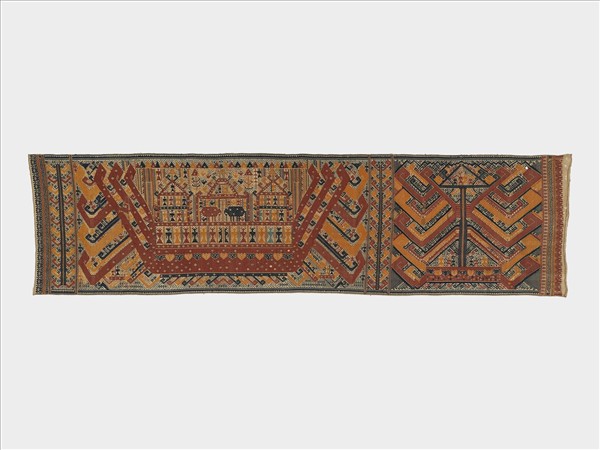 船紋禮儀掛飾,產自蘇門答臘南端的楠榜省,是當地最具特色的傳統織物。作品以手紡棉紗,於底組織間以緯線織出圖紋的緯線顯花織品。主紋飾是華麗的大型船,艙分三層內有人物、大象及犀鳥,船四周的彎鉤裝飾象徵水牛角,更外側還有小船、犀鳥、海浪等紋飾佈滿整件船紋布。船舶圖案象徵著今生與來世的人生轉換及過渡。當地貴族在如出生、結婚或葬禮等人生重大禮儀中,將長橫幅的大型織品懸掛在牆上,按照與其他貴族家庭的關係排列,顯示其社會地位及階級。這類船紋布十分貴重。是代代承繼的傳家寶。
