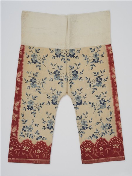 荷蘭籍男性定居印尼後,為適應熱帶氣候,通常居家會選擇穿著當地服飾,出席正式場合則為歐式裝束。此件蠟染褲即是歐洲男性的居家服或睡衣,因尺寸較小應為男童所穿。除歐洲男性外,土生華人的孩童也會穿著蠟染褲裝,因其寬鬆方便行動,且裝飾華麗廣受各族群歡迎。
