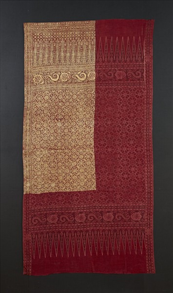 這類印度為印尼市場所生產的繪染布(kain sembagi), 早期主要生產於印度科羅曼多海岸區域。布面中心部分為連續幾何排列的花卉紋,布首兩端飾以鋸齒狀的「頓邦」(tumpal)紋飾,其間佐以花卉飾條,是印尼市場喜好的紋飾風格。進口至印尼後,當地再於織品上進行加工,增加印金作為裝飾,今日依舊清晰可見,是馬來族人在婚禮或祭典中所使用的儀式用布,極其貴重。蘇門答臘島的巨港(Palembang)、占碑(Jambi)便以製作這類華麗多彩的印金布聞名。而後,印尼以其精巧的蠟染工藝,發展出能仿製印度布的本土產布料(kain panjang)並加飾印金,多作為包裹的裙布紗龍及肩布。