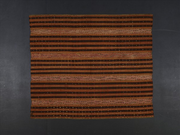 裙身以黑色和褐色經線伊卡織出底紋,加以橙色條紋相間排列。其上再鑲縫上小的雲母片或鏡子裝飾,讓裙面反射出閃爍亮點,裝飾豐富,作工繁複精緻。 印尼蘇門答臘南端楠梆省西岸考爾地區的帕敏吉爾民族擅長染織與刺繡,喜愛將雲母、鏡子或亮片縫綴在裙上,十分精緻華麗,是婚禮或節慶中的盛裝。