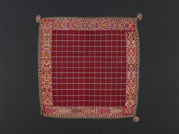 蘇門答臘西部的高地原住民——米南佳保人,文化上是由母系繼嗣。女性參加慶典時,一般會將裝有食物的黃銅器皿置於頭頂,並覆蓋這類方形蓋巾。紅地格紋蓋巾四周先以綴織技法形成裝飾帶,收邊則採用源自歐洲的蕾絲工藝。蕾絲,是藉由梭子或鉤針等工具所編織出鏤空花紋的特色織物。米南佳保的典禮用布或慶典服飾的布邊,亦常選擇以金銀線鉤編蕾絲為裝飾。