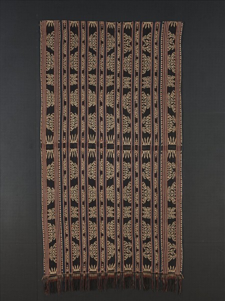 棉質伊卡披巾,由兩幅各約50公分寬的布拼接而成,兩端留有紗線的流蘇。採用經向伊卡方式製作,圖案設計為條紋與花紋相間排列,細膩且清晰的紅白兩色紋飾線條,呈現熟練的織作工藝,為印尼薩武島上男性披巾或肩布,屬於慶典時的盛裝。