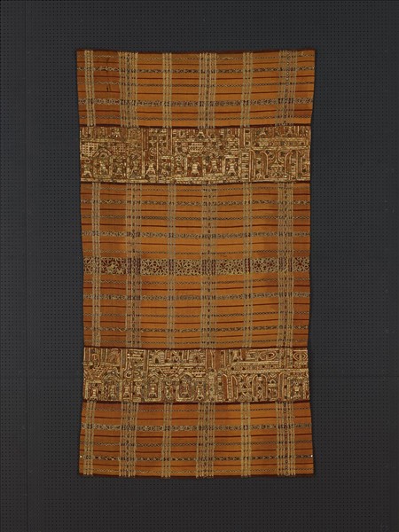 這是一件華麗的刺繡筒裙,裙布是以紅、橙和黑三色織成的橫條紋,搭配金線刺繡的縱向條紋,其上再以絲線、金屬線、金箔、亮片繡滿人物、殿宇及曲線裝飾等紋樣,線條複雜,繡工細膩,金屬線及亮片反射出閃爍光澤;整件織品色彩典雅,呈現隆重且華麗的風格,是當地貴族婦女慶典時的盛裝。