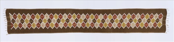 綴織技法,中文稱「緙絲」,為單層平紋組織,其在經紗的架構上,以不同色彩的小梭緯紗來回穿梭織出圖紋,故稱為「通經迴緯」。因緯紗不交錯重疊,在圖案輪廓間產生小縫隙,是主要的特徵。這件綴織棉肩布,由橙、白、黃、綠、紫的緯線織出菱形紋,色彩相鄰處出現的小孔隙,正是綴織技法形成的效果。