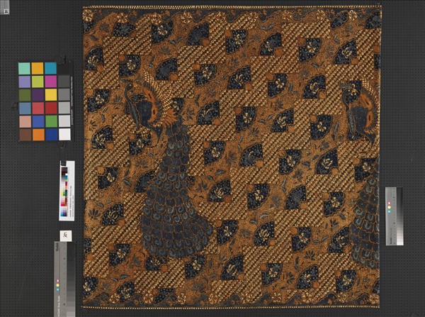 此件為古典風格的棉布蠟染筒裙,以棕、靛藍和白色為傳統的用色,染料來自大自然的鬱金和藍草。整件作品複雜密集的圖案線條,主要由手繪蠟染完成。裙布的底紋模仿傳統的巴冷紋,原為日惹(Yogyakarta)宮廷所使用的一種禁紋。巴冷紋之間交錯以扇紋與纏枝花紋,斜排形成底布圖案。裙身主花紋是拖者長尾的孔雀紋飾,每片尾羽都繪有紋樣。裙頭的紋飾更是複雜,兩隻長尾的雉雞停歇在密集的花葉卷草紋間。從其細緻流暢的圖案線條,製作過程需經多次反覆套色,都顯出蠟染工藝的精湛超凡。