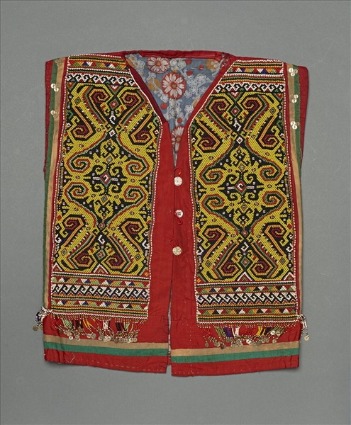這一套無袖珠繡短上衣與裙,是印尼西加里曼丹馬洛族婦女的傳統服飾。採用進口棉布縫製而成,內裡為印花棉布,表布以黃、橙、綠、紅、紫、黑、白七彩玻璃與貝殼珠子,繡成祖靈與勾紋的幾何紋飾,並以亮片裝飾下襬穗子與袖口等,十分精美。珠子是當地財富的象徵,為貴族婦女於生子、婚禮、喪禮或豐年祭等重要慶典時穿著的服飾。