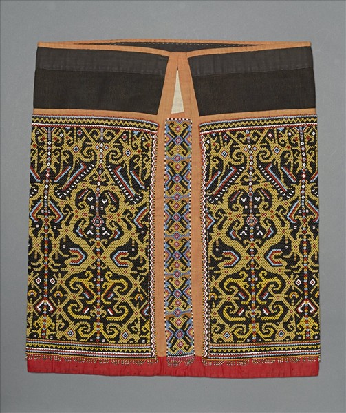 這一套無袖珠繡短上衣與裙,是印尼西加里曼丹馬洛族婦女的傳統服飾。採用進口棉布縫製而成,內裡為印花棉布,表布以黃、橙、綠、紅、紫、黑、白七彩玻璃與貝殼珠子,繡成祖靈與勾紋的幾何紋飾,並以亮片裝飾下襬穗子與袖口等,十分精美。珠子是當地財富的象徵,為貴族婦女於生子、婚禮、喪禮或豐年祭等重要慶典時穿著的服飾。
