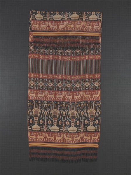 此件為印尼東森巴島上男性裙布。裙布上的圖案是採用經向伊卡技法織造而成,它是以手紡棉線作為經線,依圖案設計事先將經線分段紮緊,以紅、黃、淺藍和黑等色多次套染,織出具有對稱性的馬紋、鳥紋、魚紋、生命樹紋與建築紋樣等幾何線條構圖,呈現出地區性的特色。