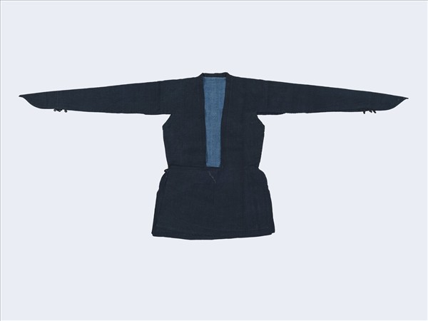 卡札爾時期(1794-1925),不分性別流行以棉布裁製外袍或上衣。這件深藍色平紋棉質長袖外套,以絎縫技法固定淺藍色的棉質內裡,縫製的壓線形成一種裝飾,使面料看起來多了些層次和立體感。外套在腋下處開口、腰線處內收後向外敞開,以及兩側開衩剪裁,都是方便活動的設計。極具特色的尖長袖口,可以蓋住手背,產生拉長上肢線條的視覺效果;若不繫袖扣或將袖口往上翻摺,藉以露出外套的內裡、穿在內層的輕薄襯衣或珠寶首飾,也是相當盛行的穿著方法。