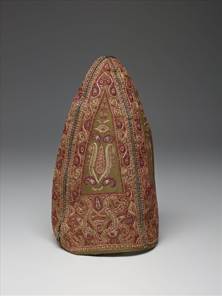 卡扎爾王朝時期(1794-1925),男女皆流行以絲綢或花色棉布裁製外袍或上衣。這件波斯男性長袖外衣,以白地多彩花卉紋棉布作面料,內層襯了跳色的紅地小花棉裡,並以黑色布料收邊。剪裁設計上,長版開襟,腰部收束後向外微敞,雙側開衩,附口袋,衣內還有暗袋。極具特色的開衩尖長袖口,是為穿著時易於翻折袖子,露出袖口內裡,以及穿在內層的輕薄襯衣或珠寶首飾。而裝飾密集,圖案細緻、連續的面料,忠實地反映了波斯人對圖案和裝飾的熱情。從傳世的繪畫中可見,穿著這類長衣或可搭配不同類型的錐形高帽。
