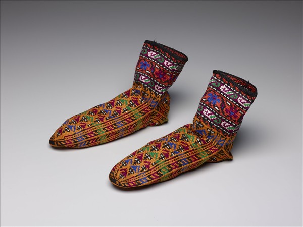 多彩針織是伊朗襪類的特色,常利用各式鮮豔的毛線交叉勾織出幾何圖案,是此地區牧羊人在放牧時,用來消遣時間的手工藝創作。選展的襪子即是由紫、綠、橘黃、紅、黑、藍等豔麗多彩的毛線勾織而成。