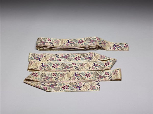 這類寬度介於1-6公分間的長條刺繡邊飾,通常用來裝飾紗麗的邊緣,是帕西女性衣櫃裡必備的單品。平針和打籽針是兩種最常被使用的刺繡裝飾技法。 黑色的長帶子上以平針繡了一連串可愛的小花。整齊的針腳多不重疊,依花瓣輪廓分層刺繡,繡線平整排列,使刺繡表面光潔,絲線光澤也更加閃爍。 米色長帶子上則以大面積的打籽針繡了繽紛的花卉、孔雀圖案。打籽針,是一種利用繡線繞結成粒狀小圈的針法。而這件作品使用的針法,也可稱為「中國打籽針」或「穗子結」。依圖案的需求,絲線打結之後,可以留下長短、方向不一的小尾巴,形成一種帶有動態感的有趣質理。