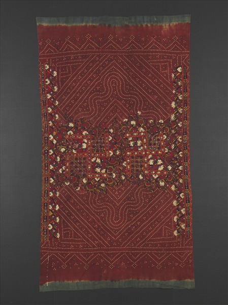 巴基斯坦的信德省與印度古吉拉特相鄰,織品服飾風格有諸多相似之處。絲質的紮染刺繡頭巾為信德省美格華(Meghwal)婦女結婚服飾之一,美格華人散佈於北印度區域,多數定居在印度,少數在巴基斯坦,在傳統種姓制度中屬最低下的賤民階級,職業多為染織,精於織品工藝。頭巾裝飾設計豐富,底紋為深底反白的紮染幾何圖案,其上以彩線繡出花朵紋並鑲入小鏡板,更顯繽紛亮麗,頭巾中央還繡出兩個卍字,在印度教中具有吉祥寓意。