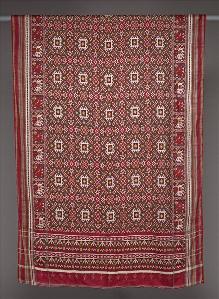 印度古吉拉特邦蘇拉特地區擅長的雙向伊卡(ikat)稱帕托拉(patola),是經、緯絲線依圖案設計先分段紮染後再進行織造,〈紅地動物花卉紋雙向伊卡紗麗〉,紅、黃、綠、白色絲線交織出菱形格紋,格紋中穿插大象、鸚鵡、花卉、牧牛女等紋飾,四周飾邊以條紋及邊框。不同於硬挺的織錦紗麗,絲織伊卡柔軟貼身,受到當地婦女喜愛。