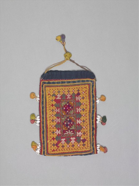 古吉拉特喀奇地區刺繡袋,以紅、黃、橙、綠、紫、黑線刺繡,中心排列花卉、周邊構圖以黃線繡滿框內,周邊加飾流穗,多彩炫目獨具特色。
