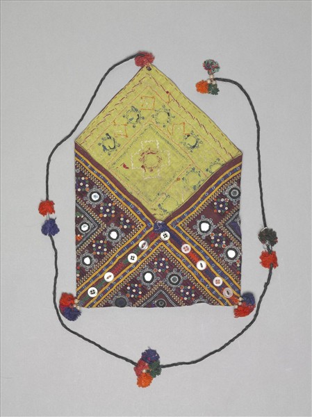 印度古吉拉特地區婦女擅長刺繡,尤其愛用鏡子、亮片等素材嵌入彩色刺繡紋樣中,在陽光下熠熠生輝。本件以橙、米、藍、綠線繡出幾何紋樣,加飾鏡子、流穗 ,閉合時呈現方形的精美刺繡袋作為嫁妝包或錢包。