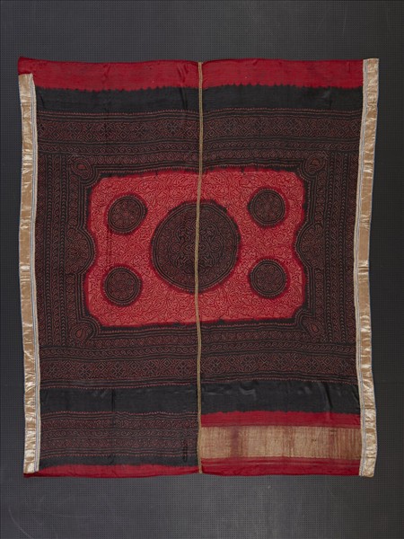 紮染頭巾,產自染織工藝發達的印度古吉拉特邦喀奇。頭巾由兩幅布料拼接而成,布幅上佈以紮染手法的小圓點呈現花草植物圖紋。紮染在印度稱為 bandhani,是以指尖挑起一小搓的布料再以線纏緊,染色後因紮緊處染液無法滲入,產生保留底色的小圓點。色彩以紅黑搭配,頭巾中央染紅色區塊,裝飾五個大小圓形,滿佈以細小圓點構成的花紋,布幅兩侧織金線邊框,閃爍華麗光澤,為當地女子於婚禮時配戴使用。