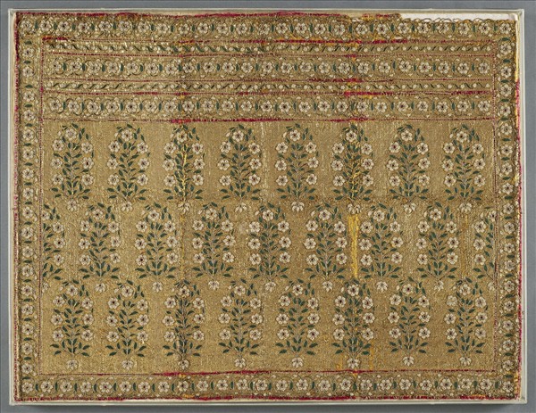 這件珍貴華麗的紗麗首面的殘片,織物的底布是以片金線和絲線交織成滿地金線,發出炫亮光澤;其上以珍珠繡出朵朵小白花,綴以紅寶石的花心,以綠寶石繡出綠葉,再以捻金線繡出整株花的輪廓線。全幅主紋由二十四株花卉植物排成三列,周圍亦以同樣材質繡出花葉枝蔓相連的長條飾紋,橫列於植物的上方以及裝飾全幅設計的周圍外框。整體設計典雅絢麗且珍貴非凡,為典型的蒙兀兒宮廷風格作品。 首面是裝飾在整件紗麗的最後一段,纏繞或披掛在上身最醒目的位置,最富有裝飾性,彰顯穿者的財富與身分地位。