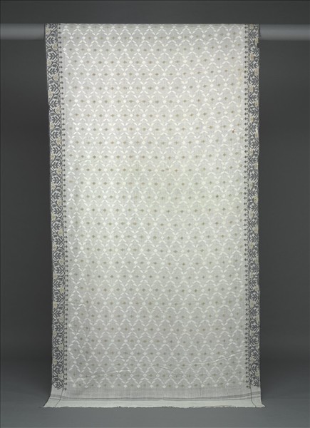 精細薄棉布的織錦紗麗,產自於織造工藝發達的孟加拉地區,當地稱為贊丹尼「Jamdani」是以纖細的棉紗織成略為透明的細薄棉布,並以黑、白兩色的緯線應用小梭迴緯的技法織出紋樣,透明的織品上可明顯看到每一朵小花紋都是獨立的緯線,而非緯線相連的通梭式織法。整件紗麗的圖案設計以金線與黑色緯線織出週遭的花邊,全幅底紋以白線菱格金線小花紋裝飾,紗麗首面並飾有金線花卉紋樣,襯托出紗麗的細膩與精緻,華而不艷,為孟加拉地區貴族或上流階層的婦女服飾。