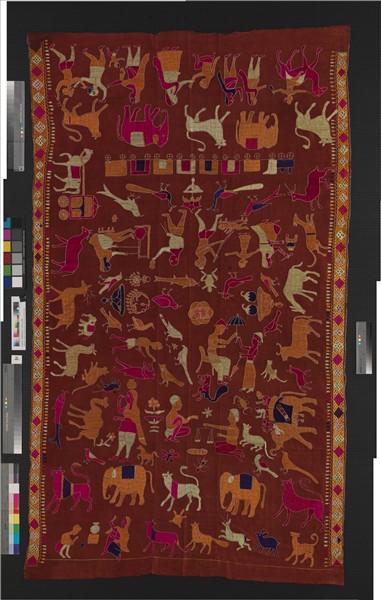 「波卡麗」(Phulkari),是旁遮普最耀眼的傳統刺繡工藝。旁遮普位於今日印度和巴基斯坦的交界。傳統上,不論宗教,女性自幼從母親、祖母或親友那裡學習波卡麗刺繡,最後這些繡品多半會成為她們的嫁妝。舉凡婚禮、節慶活動等重要日子,人們都會使用它。 這兩條矩形的波卡麗刺繡,多半作為女性頭巾。穿法類似披肩(dupatta),可以披蓋在頭上與肩上,同時圍繞頸部。棉質頭巾上的刺繡,選用了黃、白、紅、寶藍、洋紅等各色鮮豔的絲線來襯托紋樣。刺繡構圖環繞中心的團花,使四個方向皆能觀看,是一種南亞常見的佈局方式。 而這類紋樣取材與生活密切相關的波卡麗,又稱「原波卡麗」(Sainchi Phulkari)。以織補繡(darning stitch)作為主要針法,繡出了女性的生活日常與見聞,如紡紗、購物、喜愛的珠寶首飾、爭執的衝突現場、報章上時下流行的馬戲表演、來自英國的殖民官員,皆以生動的繡工,躍然布面。而自家豢養的家禽、街市往來的車輛與馬匹、帶有吉祥寓意的各式鳥類與動植物,也都是常見的刺繡元素。