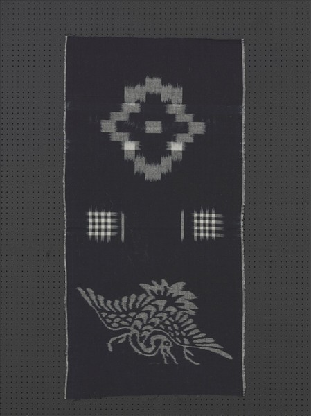 絣織技法,又稱伊卡,日文稱kasuri,先將經緯紗線分段對花紮染,再行織造,平紋交織的紋飾輪廓線,參差不齊的暈開效果,是最大的特色。本件以棉紗為材料,藍靛段染經緯紗線;絣織技法產生留白的圖案,圖案設計以直線、格子等幾何紋最常見, 隨著織機改良及技術提升,也能呈現較複雜的龜鶴等傳統紋飾。
