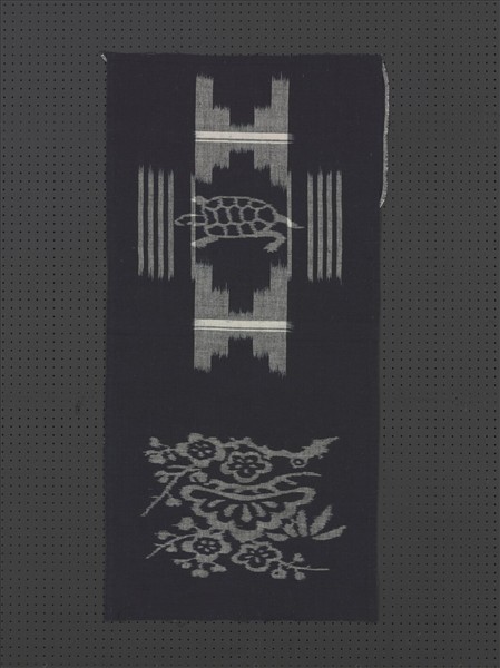 絣織技法,又稱伊卡,日文稱kasuri,先將經緯紗線分段對花紮染,再行織造,平紋交織的紋飾輪廓線,參差不齊的暈開效果,是最大的特色。本件以棉紗為材料,藍靛段染經緯紗線,絣織技法產生留白的圖案,圖案設計隨著織機改良及技術提升,也能呈現較複雜的松竹梅及龜等傳統吉祥紋飾。