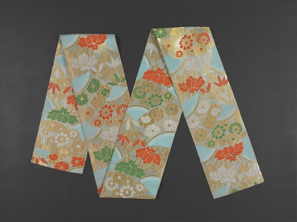 19 世紀晚期,京都的提花絲綢織造業者成立「西陣織工業組合」,並於1872 年將「西陣織」註冊商標,以推廣日本傳統的提花織錦。此件和服腰帶以水藍色絲線作平紋底組織,扇形構圖內裝飾以日本傳統菊花與竹葉紋樣,採用金、銀金屬線,以及橙、綠和白等彩色絲線為紋緯,交織出華麗的花紋,成為極富裝飾性的腰帶。