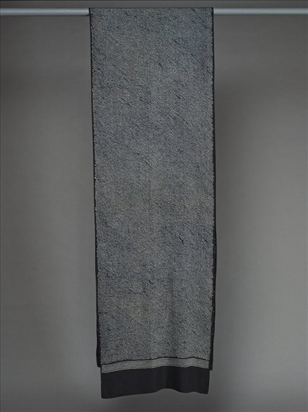 絲質的藍染腰帶,整件以紮染技法呈現留白園點,布的兩端染墨藍色,質地柔軟的腰帶,是男性用於非正式場合的兵兒帶。