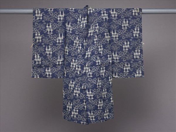 日本 藍地團鳥格子紋絣織童服