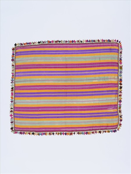 多彩方巾,橙、紫、綠、桃紅色真絲織成多彩的條紋布,邊綴飾蕾絲構成的圓形裝飾,獨具特色。這類蕾絲裝飾(oya),在歐洲被稱為「土耳其蕾絲」,裝飾在服裝、頭巾、圍巾及印花布上,以針、鉤針、梭子等編織出各種形式和圖案,常見花卉及幾何的設計。