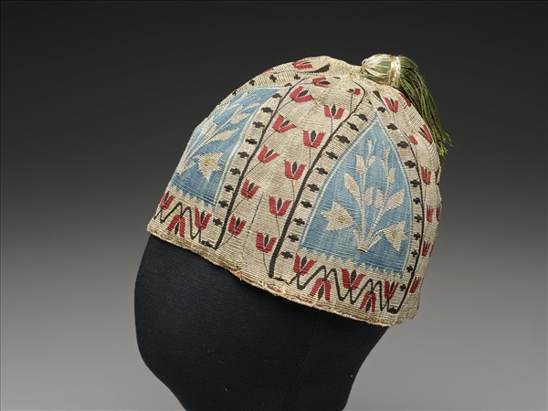 此件全帽綴織,由紅、藍、黑三色在兩側組成幾何花束圖案,是鄂圖曼土耳其帝國時期的典型紋飾。