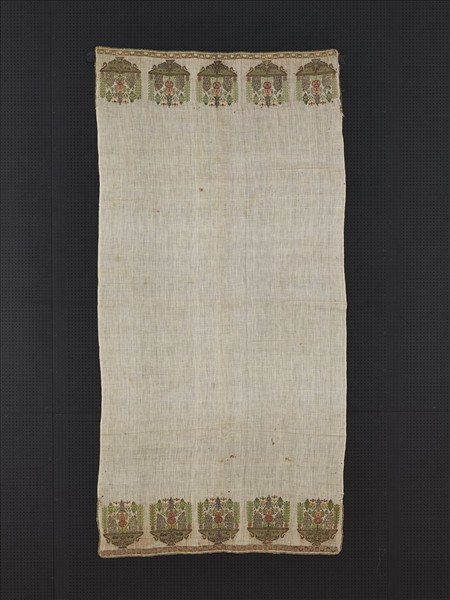 白色亞麻布長巾,兩端圖案是採用十字繡技法將花卉如盆栽般組合排列,可能是18-19 世紀受歐陸的影響。