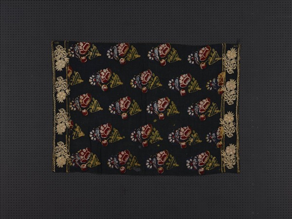 土耳其女用頭巾,上下兩端以傳統金屬線刺繡,中段的板印花卉圖繪是最大特色。土耳其版印工藝技法是由木製模具浮雕印製而成,先將木雕版塗刷顏料或染料,於布面印出輪廓後再進行著色,這種類型的版印也被稱為「手印痕」。