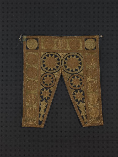 此件亞塞拜然窗簾來自阿瓦爾區(Avar),三角形開口設計方便出入;外圍三邊以幾何繡出ㄇ形,再以寬窄大小不一的八角星芒紋填滿空間,設計精美細緻。