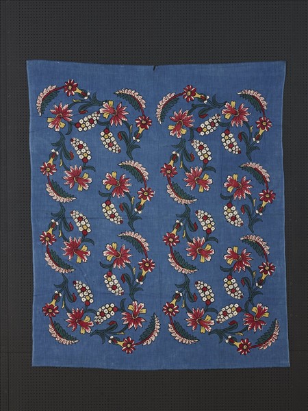 藍地印染布,由木製浮雕模具,於布面印出花紋輪廓後再進行著色,綠、紅、黃、白四色,與底部的藍色並沒有疊色效應,可知塗色以手繪完成,時而溢出輪廓線,讓花卉紋飾充滿生命力,也是手工作品獨具的魅力。
