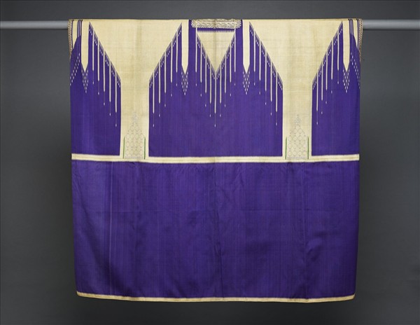 這類稱為「阿巴」(aba)的寬鬆外衣,廣泛見於中東地區,也是貝都因(Bedouins)男性傳統服飾。貝都因人是居住在沙漠地帶的阿拉伯人,他們以氏族部落為單位,過去主要遊牧於西亞和北非的荒原及沙漠之間。 「阿巴」形制多為平面剪裁的粗厚毛織外袍,一般是以羊毛或駝毛製成,常見有黑色、白色及棕色。主要將兩片約略等寬的長布水平接合,兩側等距向內摺,留下前方開襟空間,將內摺重疊處之上方縫合,使衣服整體形成矩形,近上方縫合處兩側邊各開一袖口,即可完成。 「阿巴」披罩在所有裝束之外,形似寬鬆的斗篷,長度往往過膝。前襟一般敞開,不使用釦子或腰帶固定,它沒有袖子,手腕或手臂可以從側面開口穿過,或單純將之披罩在肩上。這件紫地絲綢「阿巴」,以綴織金線作為整體裝飾,領口後方及前襟兩側再以釘金繡點綴。這種鮮艷華麗的外袍一般是名人或領袖的著裝。