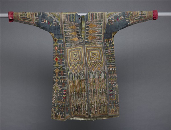 此件刺繡外套式長衫是靠近捷堡‧海倫茲(Jebel Haraz)山區的民族服裝,為女性在儀式中所穿。全件藍靛染棉布製成,繡滿精緻紋飾,開襟處從領口延伸至下擺衣角以緊密的鎖鍊繡組合而成,胸前綴有金屬亮片,呈現運用了刺繡技巧,成為超脫實用這一件服飾的藝術佳作。