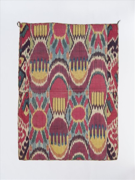 表布為絲棉交織的伊卡,裏布為棉印花布。以紅、黃、藍、綠、紫、黑、白色彩,交織出梳子、波浪與幾何圖形組成的複合圖案設計,稱為「Haft rang」的多彩掛飾。此類多彩複合的設計,僅出現在早期的伊卡風格中。推測原為大掛飾殘片,經修整後做成小的掛飾。