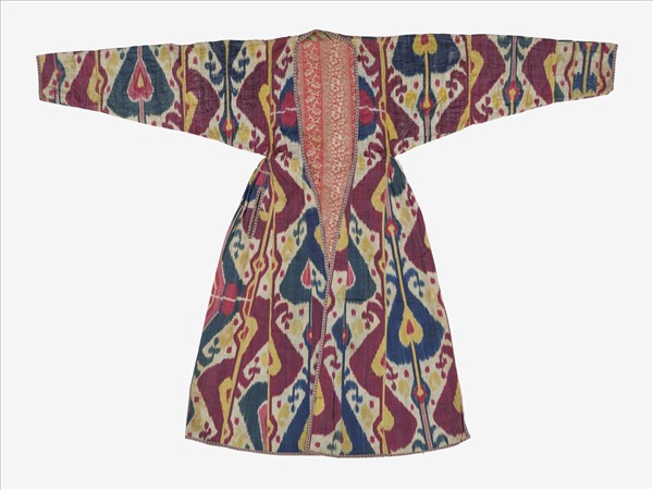 表布為白、黃、紅、藍、綠五色的絲質伊卡,內裡為印花棉布。以拉長的石榴紋作對稱的合成圖形,其間散布小圓點的設計,為十九世紀早期流行圖案。 外袍的腋下縫接以檔布,方便活動,右脇邊有口袋設計,十分罕見別緻。
