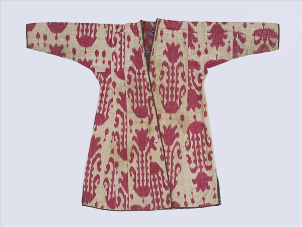 表布為絲棉交織的伊卡,裏布為棉印花布。在白色底上做紅色的單色伊卡,圖案卻是花卉與盆栽的細膩線條,可見設計者的用心,讓整件袍服更顯價值。