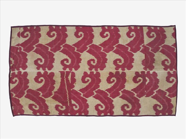 表布為絲棉交織的伊卡,背襯以棉質印花布。本掛飾為紅白兩色交叉排列的羚羊角圖紋伊卡,色彩雖然簡單,然而紗線紮染的工序十分到位,在白色底上,清晰呈現波浪曲線裝飾的羚羊角圖案,簡單鮮明,富有現代感。