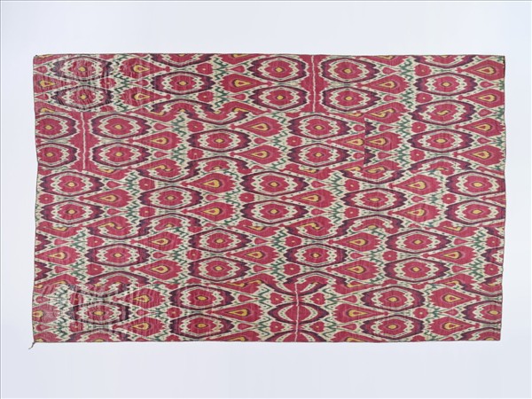 表布為絲棉交織的伊卡,背襯以棉質印花布。以深紅、淺紅、黃、綠、紫和白色交織的多彩伊卡Haft rang (seven colours),以石榴、小花、眼睛圖紋組合設計圖案。