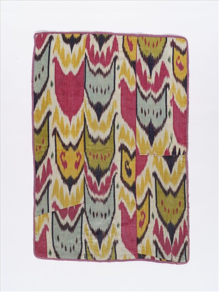 表布為絲棉交織的伊卡,背襯以棉質印花布。 以以紅、黃、藍、綠、藍、黑和白色交織的多彩伊卡Haft rang (seven colours),圖紋設計類似草原上的狐狸或動物的臉形,反映出來自生活環境的靈感。