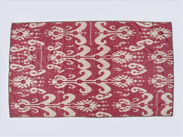 表布為白、紅二色絲棉交織的伊卡,背襯以棉印花布。主圖為從花盆中長出整株的花卉植物,羊角形卷曲的葉子,搭配抽象的花朵,花盆加上小卷紋和吊飾紋裝飾,其間以草履蟲紋裝飾,整幅伊卡色彩簡單,圖案線條講究,以細膩繁複的曲線呈現。