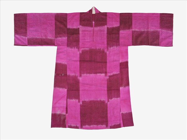 絲棉交織伊卡,無內裡。T型款式,前開半襟至胸線上,可能為未婚婦女的上衣。以紅、紫兩色做方形伊卡,布面有經過水波紋軋光(moire),表現近代的簡化風格。